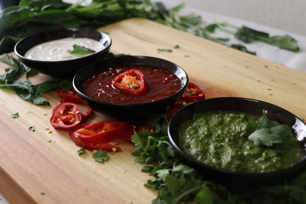 Several different types of yogurt dips and chutneys laid next to flatbread slices.