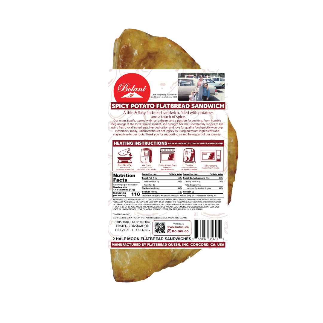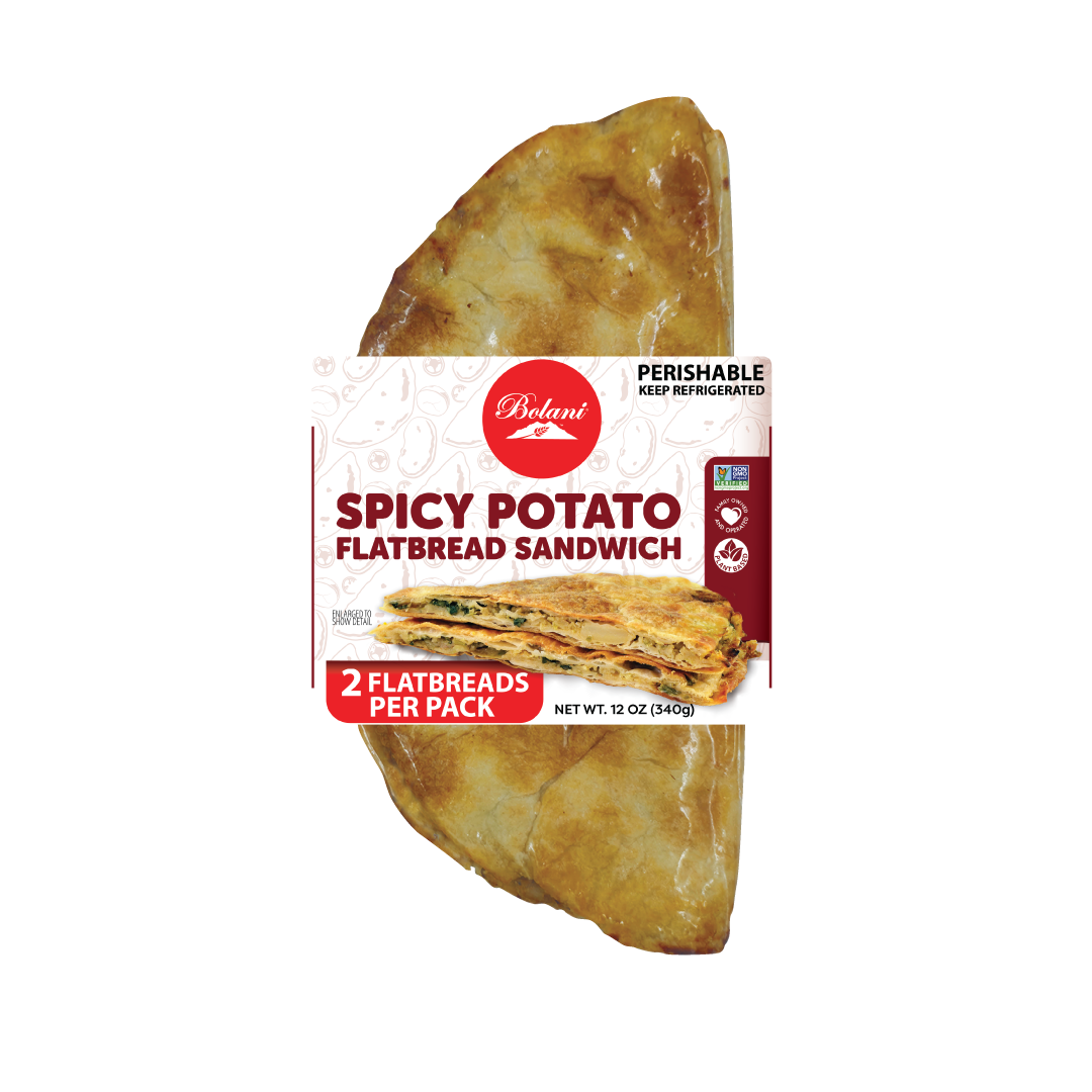Our basic bolani recipe, with a kick! We added spiced potatoes, layered with savory and sweet spices, to our traditional flatbread, and it became one of our customers’ favorites! The ideal snack for those looking for a little heat, our recipe pairs excellently with a cooler element – think greek yogurt tzatziki, fresh vegetables, or topped with shredded cheese and griddled, and served as a side to your favorite veggie-based soup.