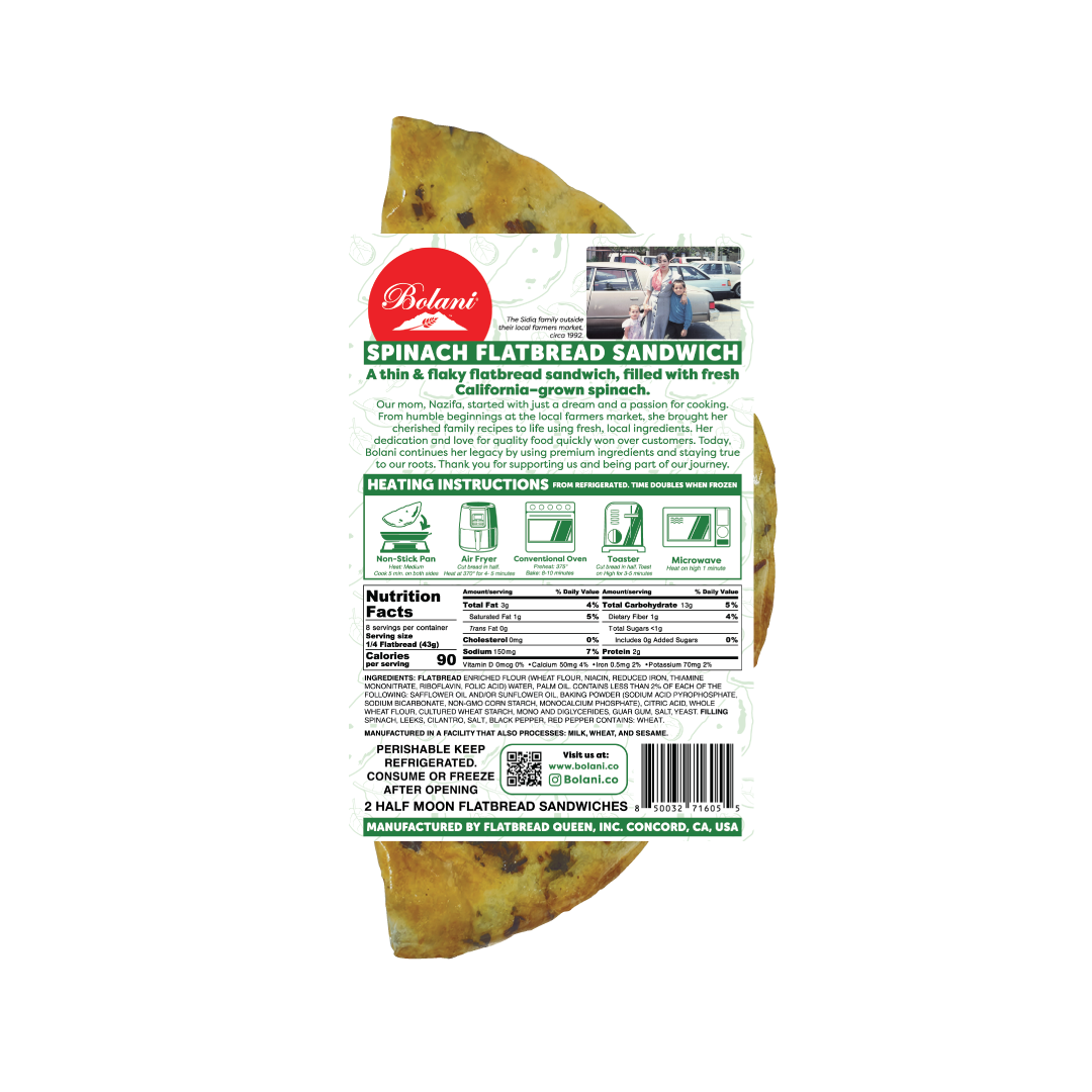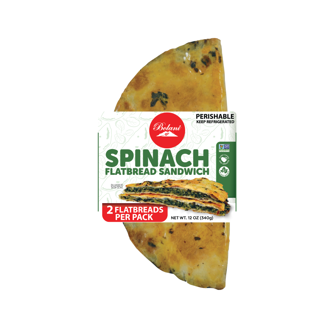 A thin & flaky flatbread, filled with California-grown spinach.