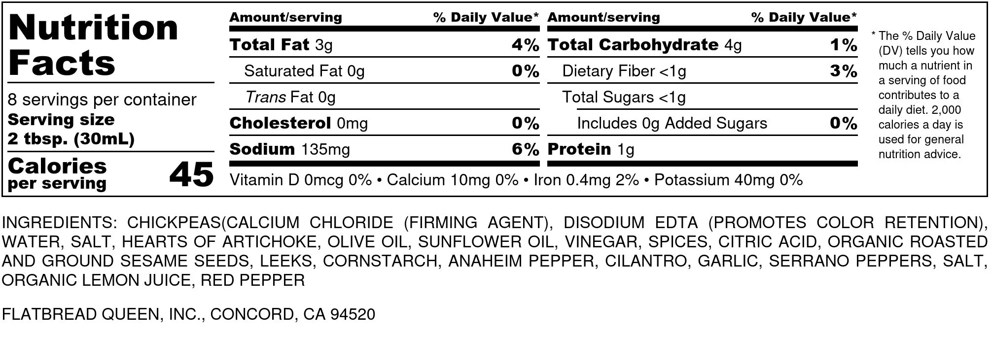 Do you love the taste of a well-prepared artichoke? With bright flavors of lemon, garlic, tahini, leeks, all blended with chickpeas, it’s a delicious upgrade to our classic hummus. We love it paired with fresh vegetables, topped with fresh squeezed lemon, or as a spread on sandwiches or wraps.